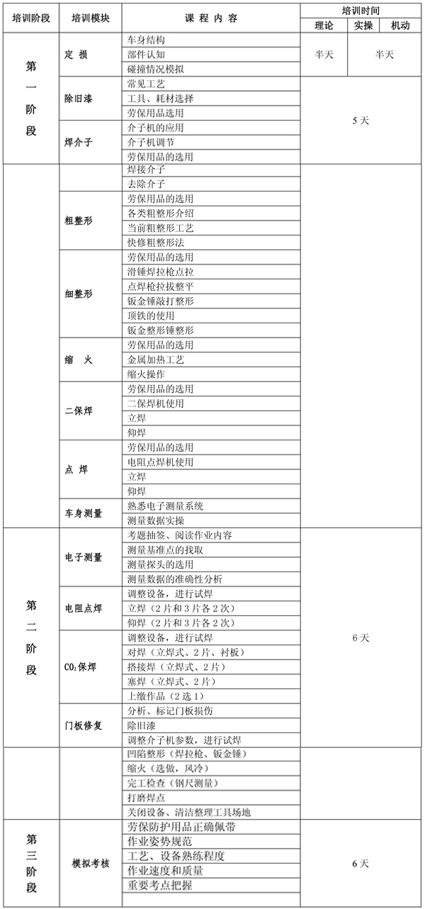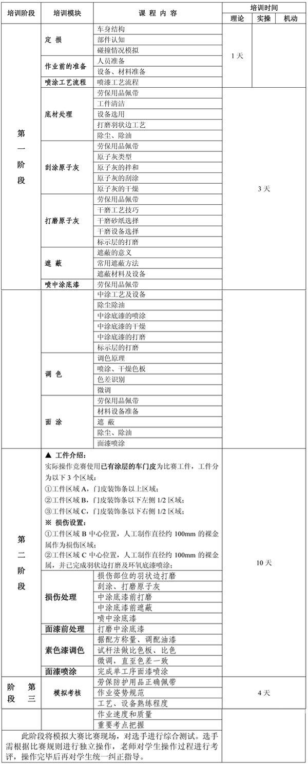 整個(gè)培訓(xùn)課程分三個(gè)階段,其中第一階段先按車身修復(fù)的基本工藝驟步培訓(xùn),時(shí)間約為10天;第二階段則以競(jìng)賽項(xiàng)目專項(xiàng)培訓(xùn),時(shí)間也為10天;第三階段主要以模擬大賽現(xiàn)場(chǎng),進(jìn)行綜合強(qiáng)化訓(xùn)練。詳情見下表: