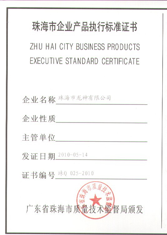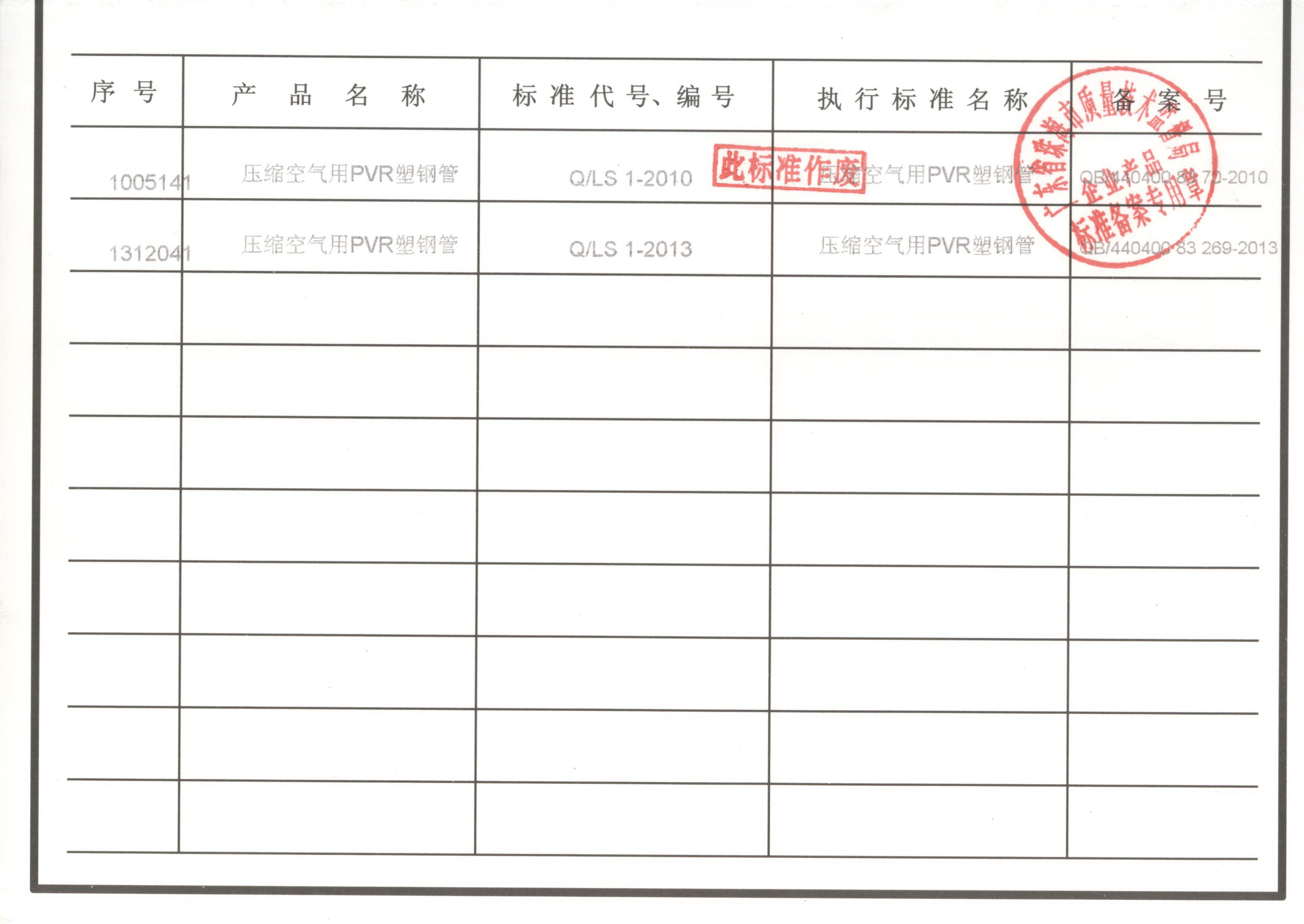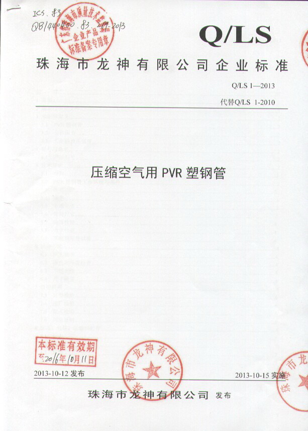 企業(yè)執(zhí)行標(biāo)準(zhǔn) 珠海市企業(yè)產(chǎn)品執(zhí)行標(biāo)準(zhǔn)證書 珠海市龍神有限公司企業(yè)執(zhí)行標(biāo)準(zhǔn) 壓縮空氣用PVR塑鋼管 2012-11-27 35348